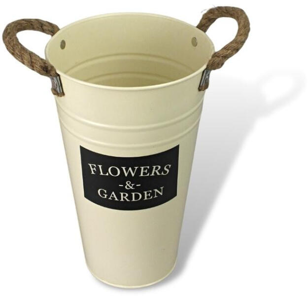 "Flowers & Garden" feliratos magasított bádog váza, kötél fülekkel.