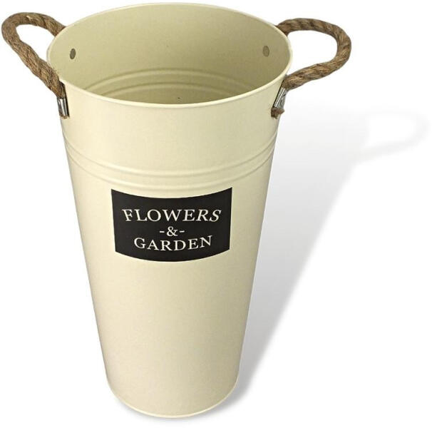 "Flowers & Garden" feliratos magasított bádog váza, kötél fülekkel.