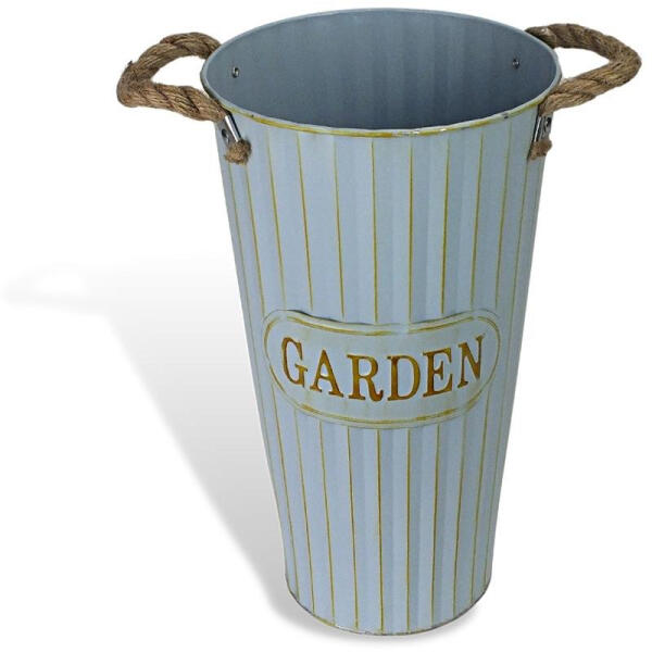 "Garden" feliratos magasított bádog váza, kötél fülekkel.