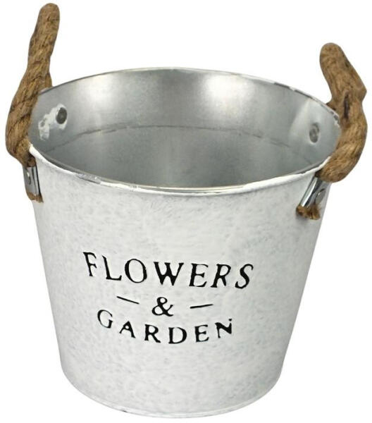 "Flowers & Garden" feliratos bádog kaspó, kötél fülekkel.