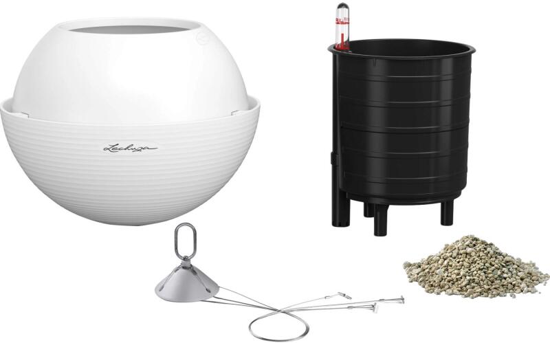A fehér, 23 cm átmérőjű Lechuza Bola Color 23 függő virágtartó egy olyan kaspó, amely integrált öntözőrendszerével nyűgöz le. A kaspó gyorsan beültethető és könnyen rögzíthető. A mellékelt nemesacél felfüggesztés rozsdamentes és biztonságosan tartja a növényeket. A finom barázdált szerkezet izgalmas kontrasztot teremt a sima felülethez képest. A Bola Color lehetővé teszi, hogy növényeit magasan helyezze el.
