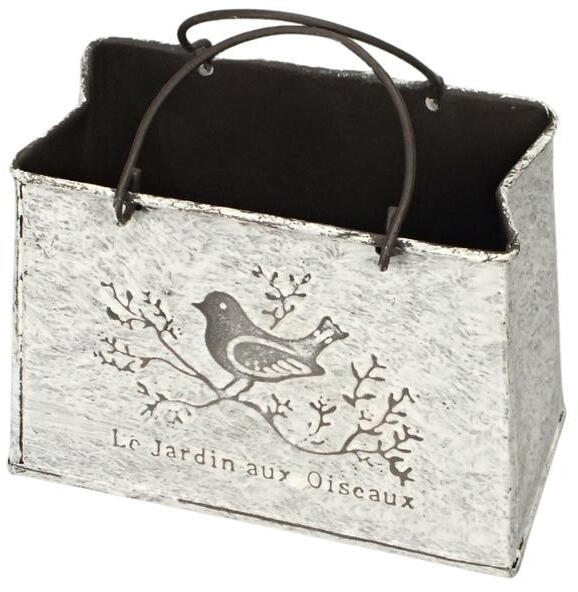 Madárkás vintage bádog ovál kaspó, fém fülekkel.