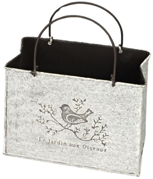 Madárkás vintage bádog ovál kaspó, fém fülekkel.