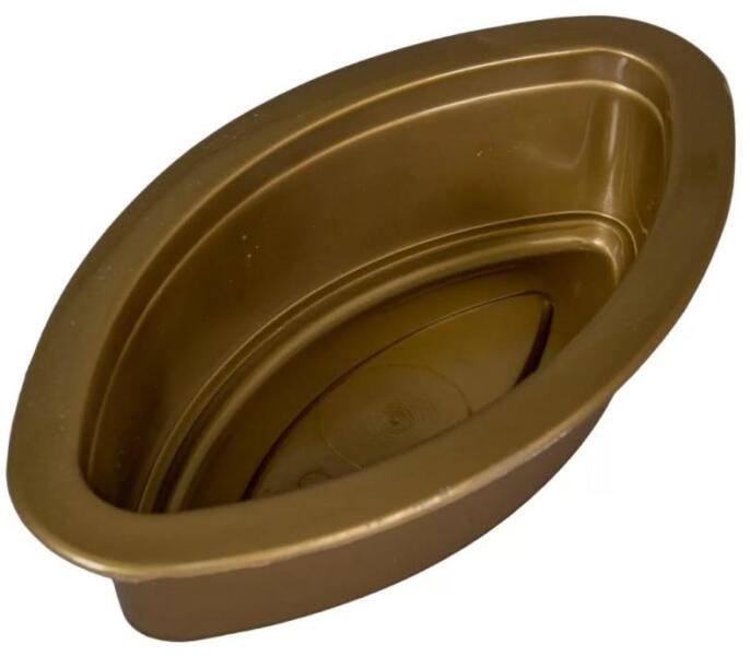 Műanyag közepes hajó – arany színű (Méret: 6,5 cm magas, 25 cm hosszú) Elegáns, dekoratív műanyag hajó forma virágkötészeti és kegyeleti kompozíciókhoz Ez a közepes méretű, arany színű műanyag hajó alakú tál stílusos és tartós alapot kínál virágkompozíciókhoz, kegyeleti díszekhez, valamint ünnepi dekorációkhoz. Az arany szín eleganciát és ünnepélyességet kölcsönöz, így tökéletes választás sírdíszekhez és beltéri dekorációkhoz egyaránt. Könnyű és ellenálló műanyagból készült, amely egyszerűen tisztán tartható és hosszú távon használható. Termékjellemzők:Magasság: 6,5 cmHosszúság: 25 cmAnyag: tartós műanyagSzín: aranyAlak: hajó forma, közepes méret