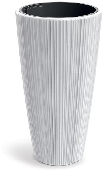 Modern, bordázott felületű, magas virágcserép, amely elegáns megjelenést kölcsönöz teraszokon, kertekben és beltéri terekben egyaránt. Tartós, UV-álló műanyagból készül, így ellenáll az időjárás viszontagságainak is. A belső betét megkönnyíti az ültetést és a növények áthelyezését, a vízelvezető rendszer pedig megakadályozza a túlöntözést.