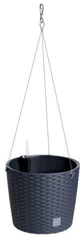 Virágcserép beltérre és kültérre, 8,9 l térfogatú, érdekes kialakítású. Felfüggesztésre alkalmas, kerek alakú. Minőségi anyagok - műanyag és fém. Antracit színű, átmérője 25,6 cm, magassága 21,9 cm.