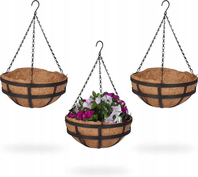 Relaxdays Függő Virágtartó Kosár Kókusz Cserép Szett 3 Db 30x30x65 cm Fekete Barna (129856)