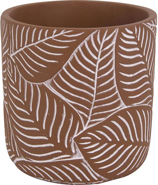 A dekoratív virágtartó kisebb és közepes méretű növények beltéri elhelyezésére alkalmas. Magassága 14,5 cm, átmérője 14,5 cm. A virágtartó barna színű cementből készült. Modern növényi mintázatával és strukturált felületével gyönyörű látványt nyújt otthonában - akár a komódra, akár az ablakpárkányra vagy a polcra helyezi.