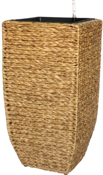 A magas virágcserép a különösen igényes, mélyen gyökerező futónövényekhez alkalmas. De a magasra törő növények is megfelelő ellátást kapnak benne. A virágtartó kiválóan alkalmas a kültéri, teraszon vagy erkélyen történő elhelyezésre. A legjobb ellátás a növényeknek A kúp alakú cserép felül négyzetes felülettel bír. A magas oldalfalaknak köszönhetően az alapterület elég keskeny, ami elegáns és finom hatást kelt. A formaterv ázsiai hangulatot áraszt, ami a bambusz hatású megjelenésen és a natúr színen alapul. Strukturált anyaga esetében a kedvelt polirattanról van szó. A műanyag fonat könnyen ápolható és rendkívül tartós. Az ültetőbetét öntözőrendszerrel rendelkezik. A betét alatt az öntözés következtében víztározó alakul ki. A növény gyökerei belenőnek ebbe a víztározóba, és szinte önállóan látják el magukat. A töltésszintjelzéssel egyszerűen megállapítható, hogy mikor fogyatkozik meg a víz és van szükség öntözésre. Így nem jelent gondot, ha néhány napig nem tartózkodik otthon. A pangó víz elkerülése érdekében az öntözőrendszer használata csak beltéren vagy fedett kültéri helyeken javasolt. Az állítható magasságú lábak a talaj egyenetlenségeinek kiegyenlítésében segítenek. A pangó víz elkerülése esetén a cserép -10 °C-ig fagyálló, és emellett időjárásálló is. Magassága 53 cm, oldalainak mérete 28 cm x 28 cm (Sz x Mé).