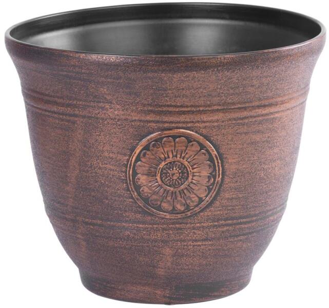 A fém hatású formatervezett virágcserép remek választás bármely kertbe, teraszra vagy erkélyre. UV stabil. Szín: réz. Mérete 30 x 25 cm.