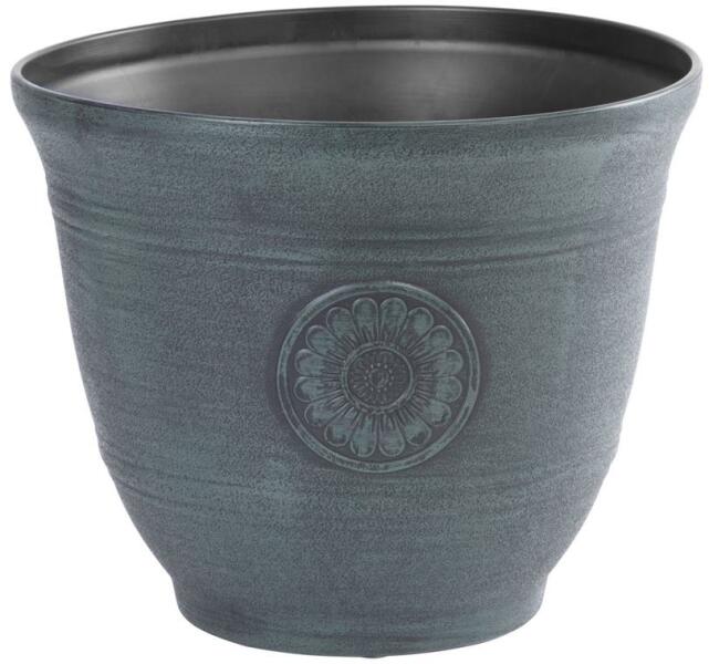 A fém hatású formatervezett virágcserép remek választás bármely kertbe, teraszra vagy erkélyre. UV stabil. Szín: zöld. Mérete 30 x 25 cm.