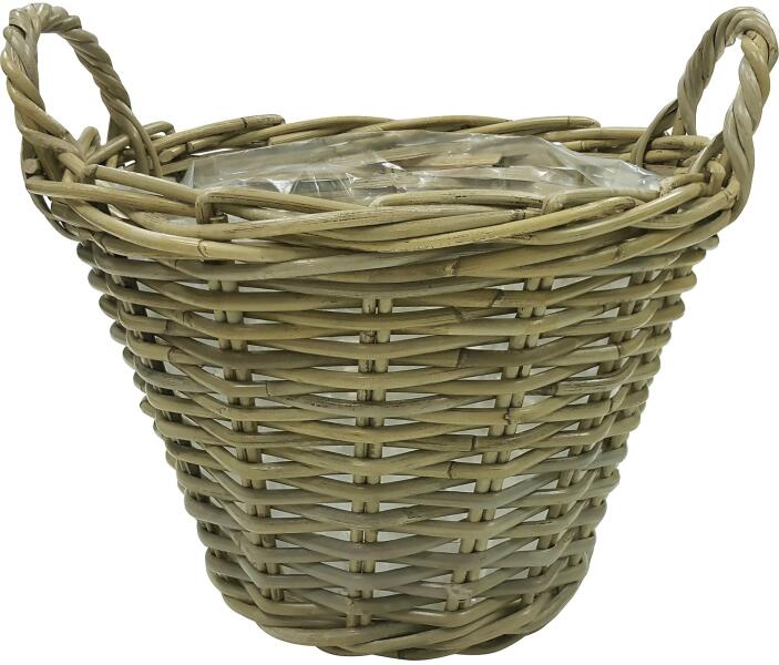 Ez a rattanból készült virágkosár rendkívül trendi és két füllel rendelkezik. Sokoldalúan alkalmazható. A kosarat ezen kívül egy fóliával is ellátták, így akár be is ültetheti.